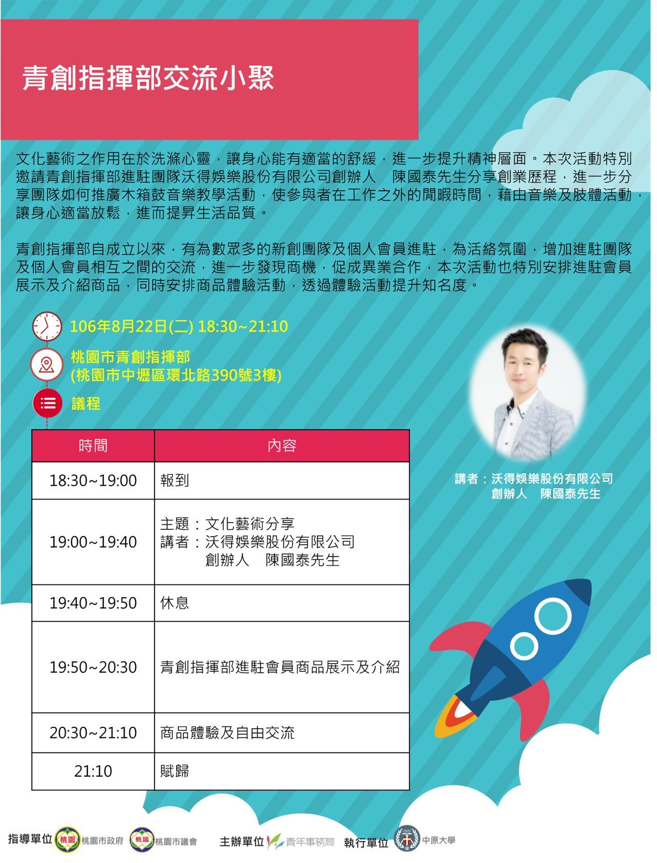 本次活動特別邀請青指部進駐團隊沃得娛樂股份有限公司創辦人 陳國泰先生分享創業歷程,進一步分享團隊如何推廣木箱鼓音樂教學活動。青創指揮部自成立以來,有為數眾多的新創團隊及個人會員進駐,為活絡氛圍,增加進駐團隊及個人會員相互之間的交流,本次活動也特別安排進駐會員展示及介紹商品,同時安排商品體驗活動,了解新創產品設計及研發,歡迎您來參加。