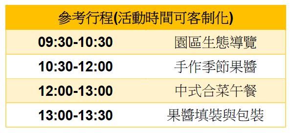 活動名稱:手作季節果醬團體半日遊(園區生態導覽+手作季節果醬+中式合菜)