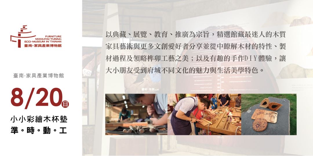 第二場:8/20 (日) 臺南·家具產業博物館-『小小工藝家』(彩繪木工杯墊DIY)*限6歲以上孩童報名參加,需家長陪同