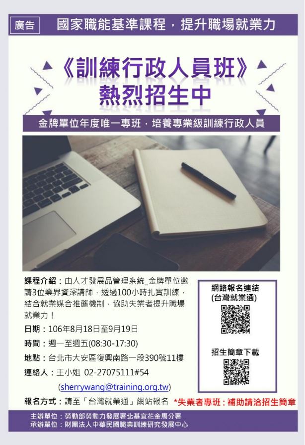 - 連絡人:王小姐 02-27075111#54 (sherrywang@training.org.tw)
