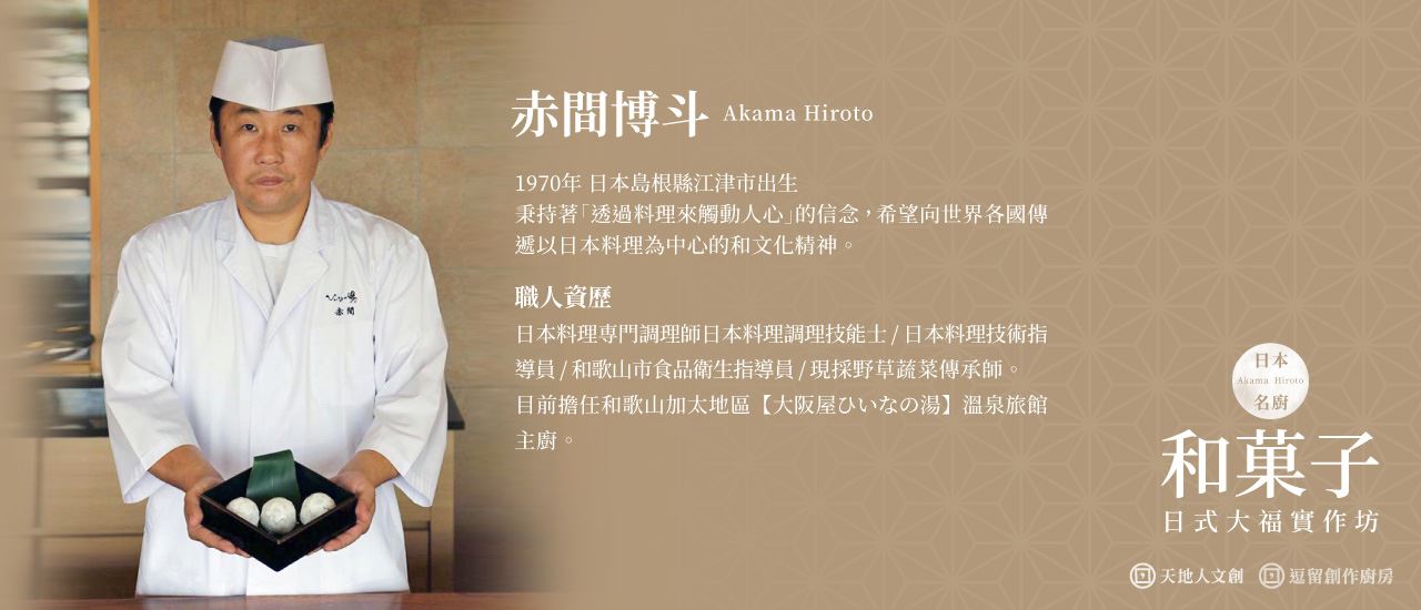 赤間博斗於日本島根縣江津市出生,老家就是料理店,因而自小就深受和料理文化薰陶,現為歌山加太地區「大阪屋ひいなの湯」溫泉旅館的主廚,秉持著「透過料理來觸動人心」的信念,希望向世界各國傳遞以日本料理為中心的和文化精神。