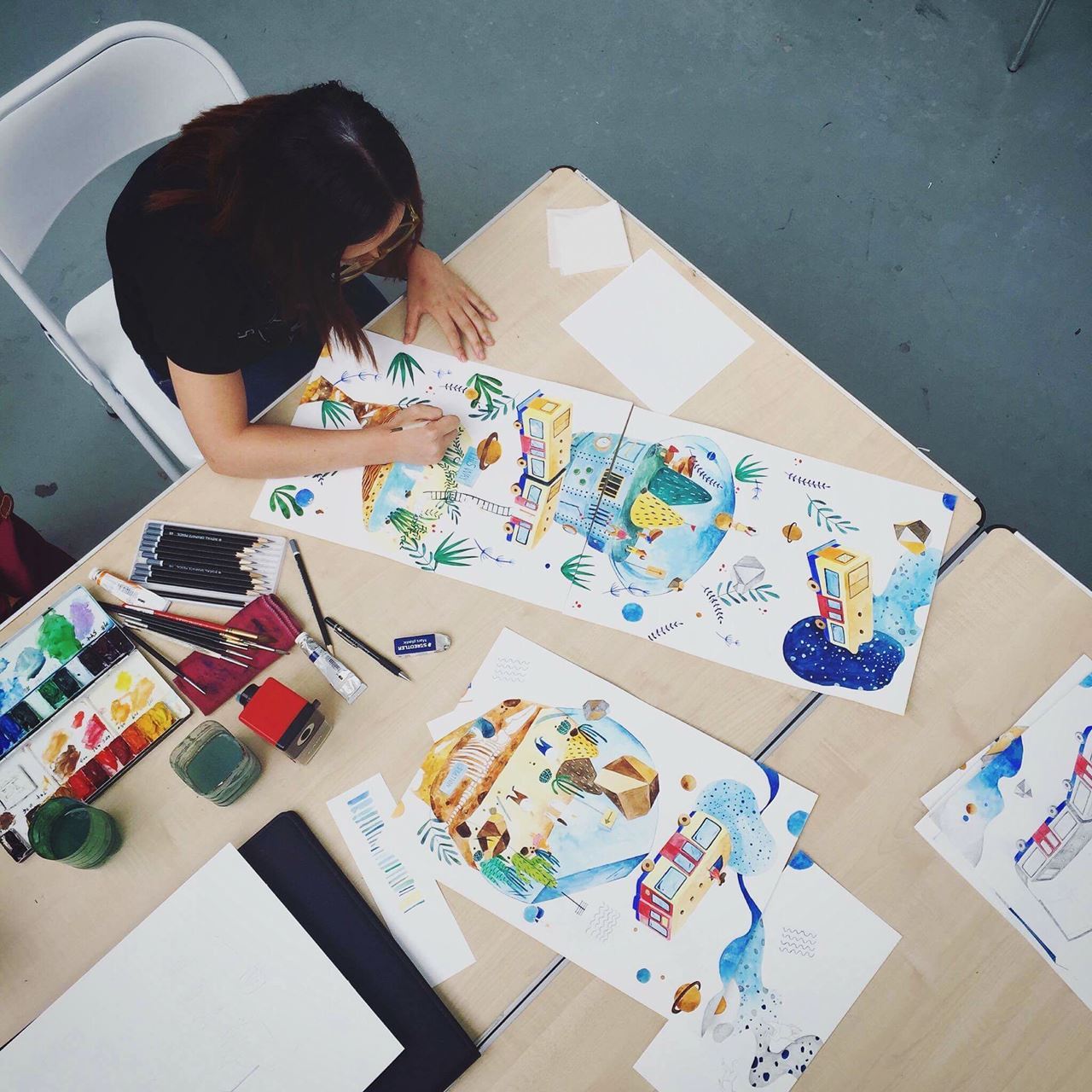 大學就讀視覺傳達,做了一段時間的美術編輯,最後決定插畫還是最愛,便到了英國,在英國創意藝術大學(University for the Creative Arts)學習插畫。在英國期間穿梭在各個獨立出版手作市集、搜集不同的印刷品,偶而自己也到市集擺攤。
