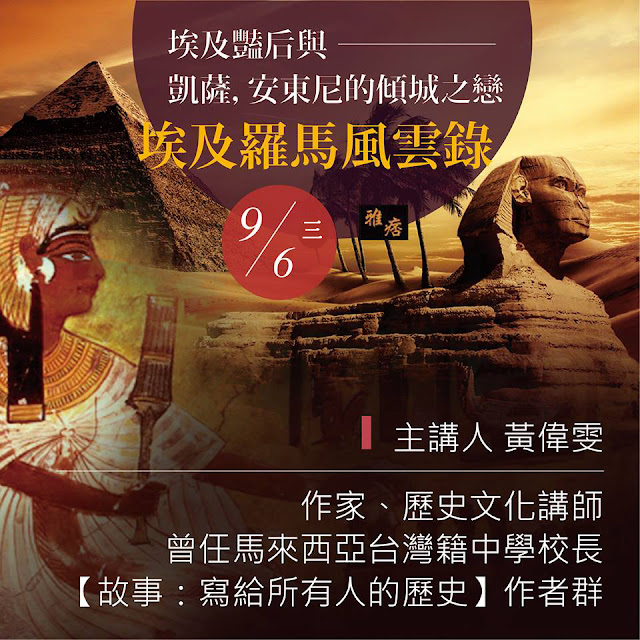關注歷史文化的作家 黃偉雯將帶我們認識神秘的『埃及艷后』與兩位帝王間的絕世愛情、『埃及』與『羅馬共和與帝國』的歷史故事,暸解那段長存史詩之中引人無限懷想的古羅馬時代!