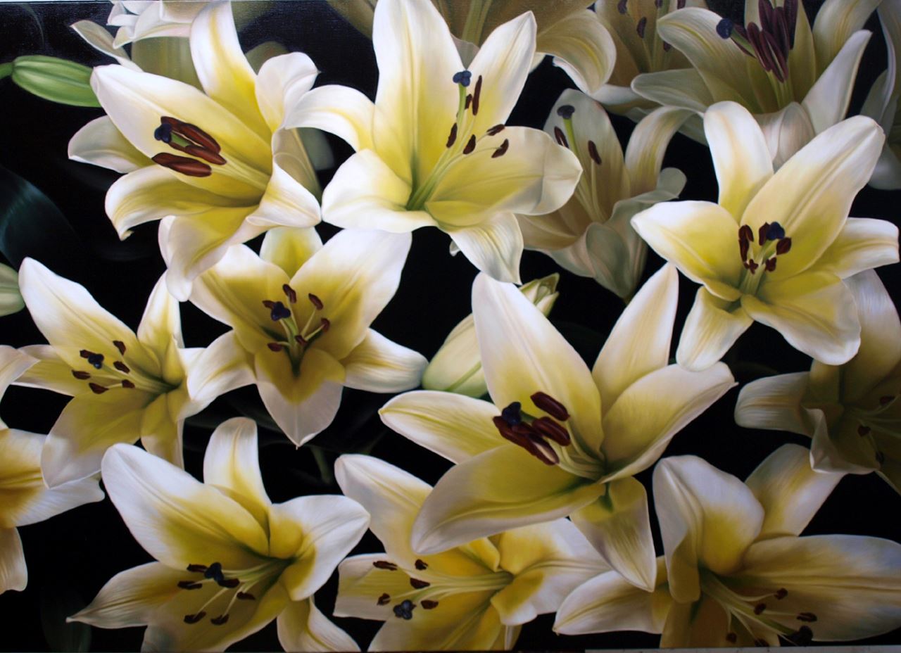 盛開的姬百合,綻放在觀者面前。梁至青大尺幅的寫實作品,給人一種逼人的真實,著實帶來強烈的視覺震撼力量。對一切進行細緻和真實的觀察和描繪,其巨大的張力和極強的畫面構圖,完全吸引了眾人你我的目光。