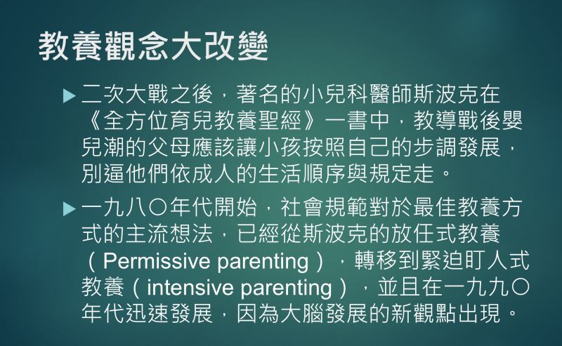 《階級世代》書中關於教養的章節,記錄了美國的教養觀念大改變。二次世界大戰之後,美國曾經風行「自然成長」的教養,認為每個小孩都有自己的發展步調,不應該過度刻意去規劃,要求小孩子在某個階段一定要做到什麼事情。
