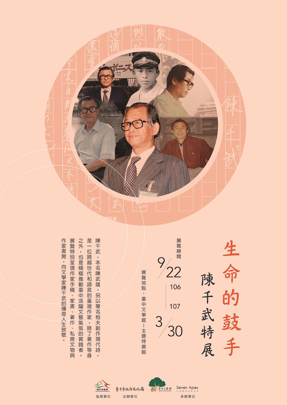 陳千武,本名陳武雄,另以筆名桓夫創作現代詩,是一位跨越世代和語言的臺灣作家,除了著作等身之外,也是積極推動臺中活躍文藝氣氛的實踐者。展覽特別呈現作家手稿、家書、著作、私房文物與作家書房,向文學家陳千武的傳奇人生致敬。