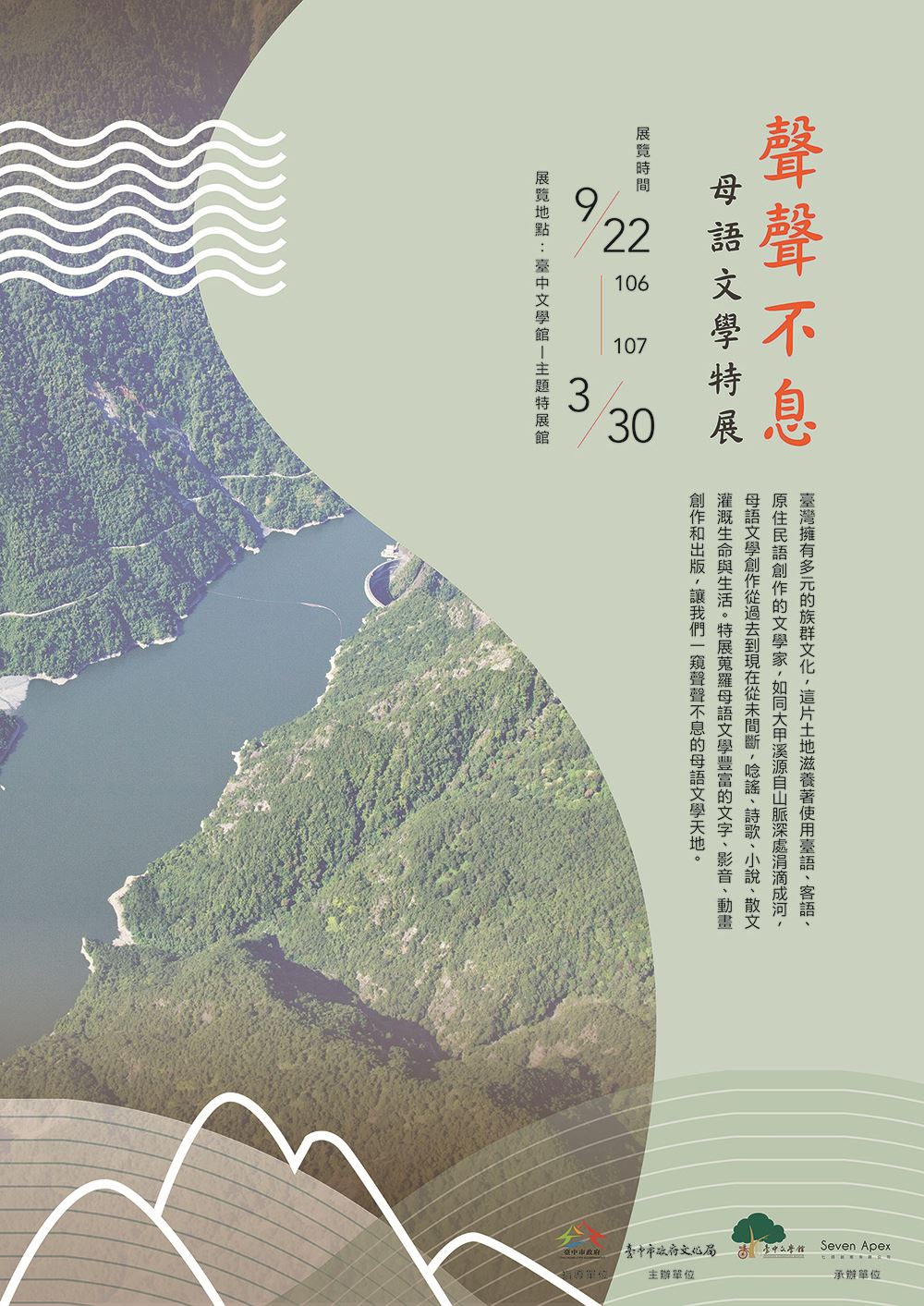 臺灣擁有多元的族群文化,這片土地滋養著使用臺語、客語、原住民語創作的文學家,如同大甲溪源自山脈深處涓滴成河,母語文學創作從過去到現在從未間斷,唸謠、詩歌、小說、散文灌溉生命與生活。特展蒐羅母語文學豐富的文字、影音、動畫創作和出版,讓我們一窺聲聲不息的母語文學天地。