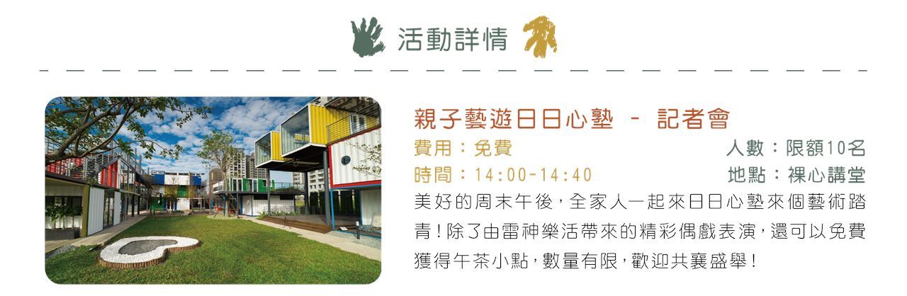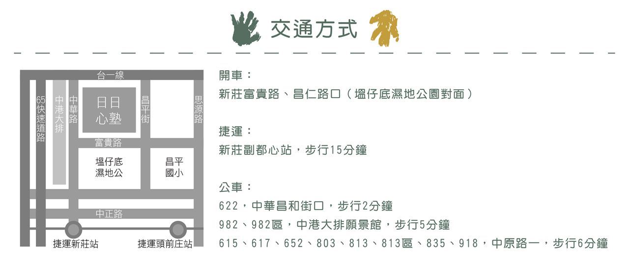 重要連結導航網址:https://goo.gl/Rt9slM主辦單位-日日心塾:https://ppt.cc/fisl5x贊助單位-暉騰建設:http://www.htarchi.com/index.php協辦單位-iMatch文創咖啡廳:http://imatch.moc.gov.tw/如對活動內容及報名有相關疑問,歡迎洽詢:電話:(02)6631-1343 呂小姐信箱:p3197510@micmail.iii.org.tw