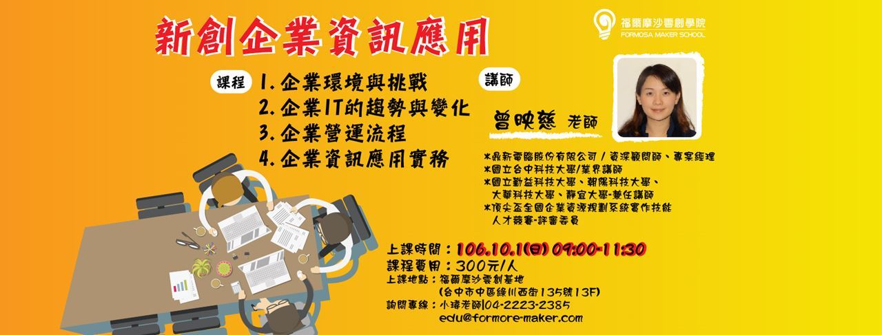 企業資訊應用實務:了解建構企業e化完整版圖,從ERP企業資訊規劃、CRM客戶關係管理、SCM供應鏈管理、PLM產品生命週期管理、BPM企業流程管理、BI商業智慧、FLOW電子簽核等應用,如何發揮企業資訊應用價值。