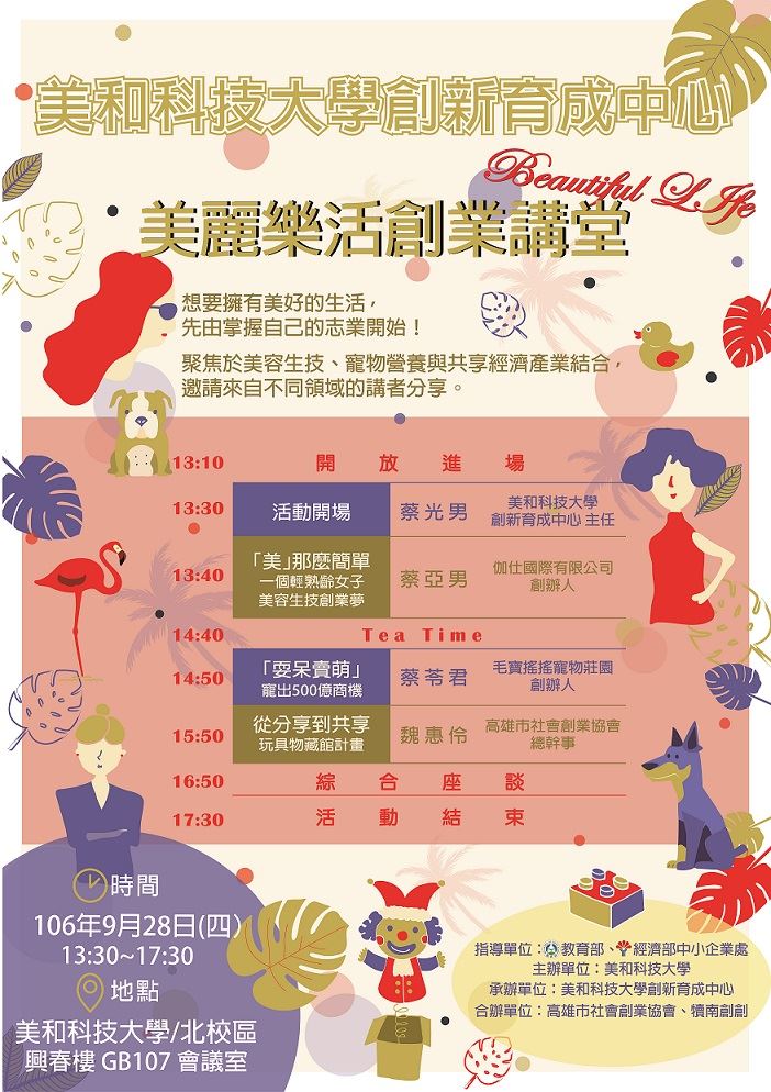 歡迎9/28(四)13:10到台灣最南端的美和科技大學,聽聽這些在南部努力耕耘自己、實踐志業的創業者們的故事。