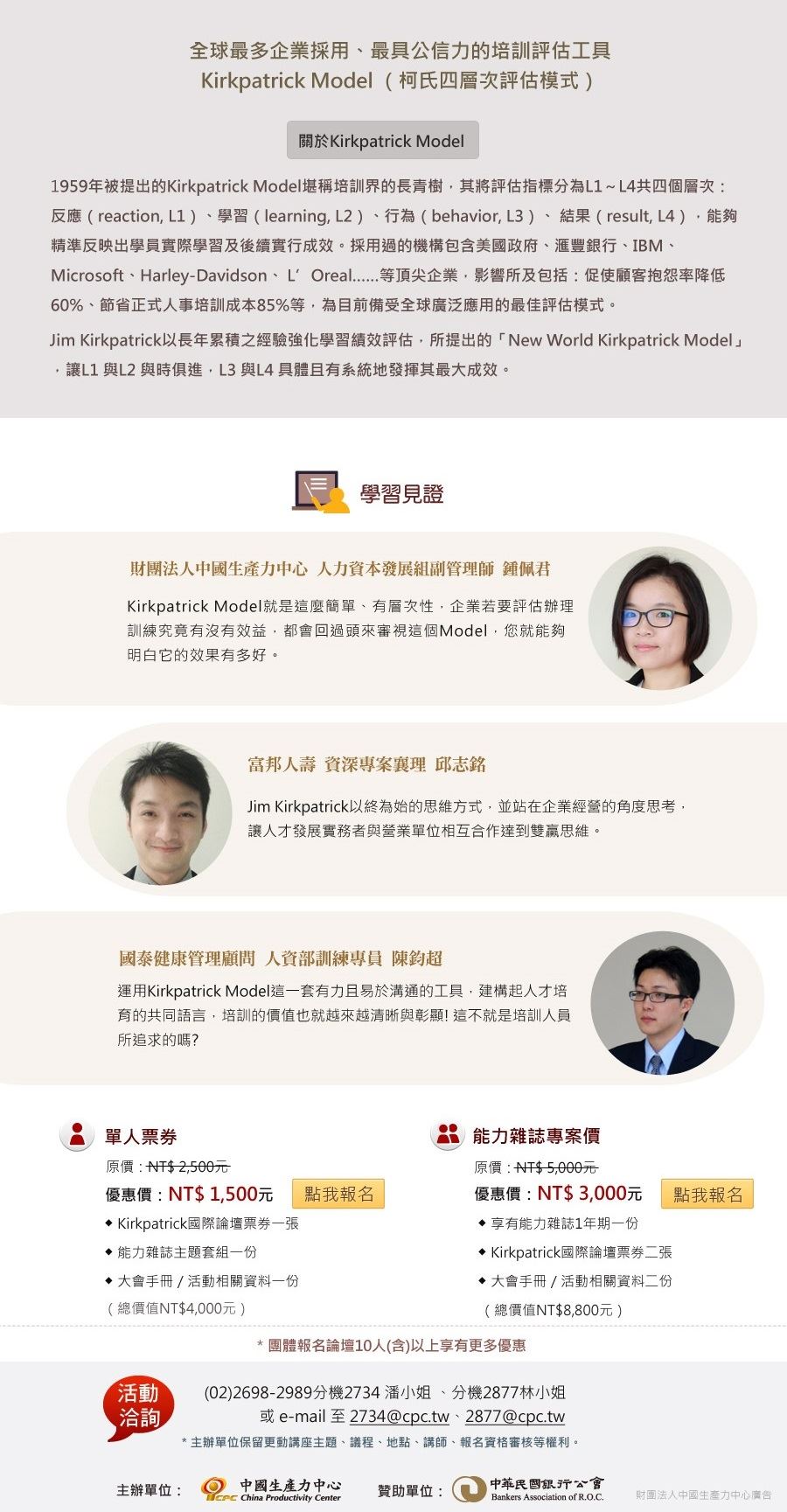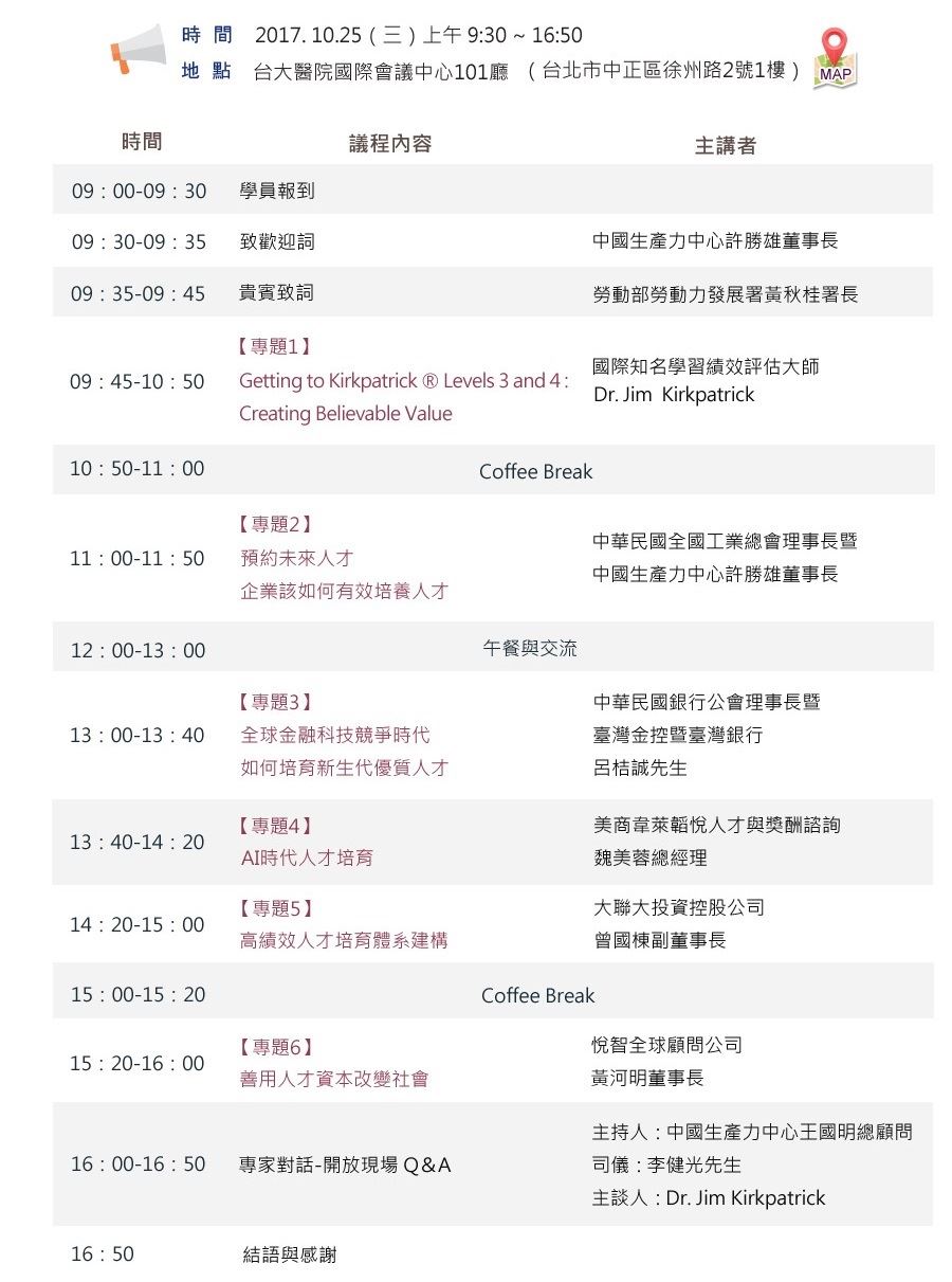國際知名學習績效評估大師Jim Kirkpatrick首度受邀來台,將於2017年10月25日-27日舉辦「國際論壇暨認證工作坊」,此次邀請勞動部勞動力發展署黃秋桂署長擔任國際論壇活動貴賓,一同為這場論壇盛事揭開序幕,除了Jim Kirkpatrick專題演講外,並邀請中華民國全國工業總會理事長暨中國生產力中心許勝雄董事長、臺灣金融控股公司暨臺灣銀行呂桔誠董事長等多位重量級講者,探討在全球科技變革的環境下,人力資源轉型與未來人才培育之關鍵課題,最後,邀請Jim Kirkpatrick再度上台進行專家座談,並現場開放問答時間,精彩內容絕對可期。