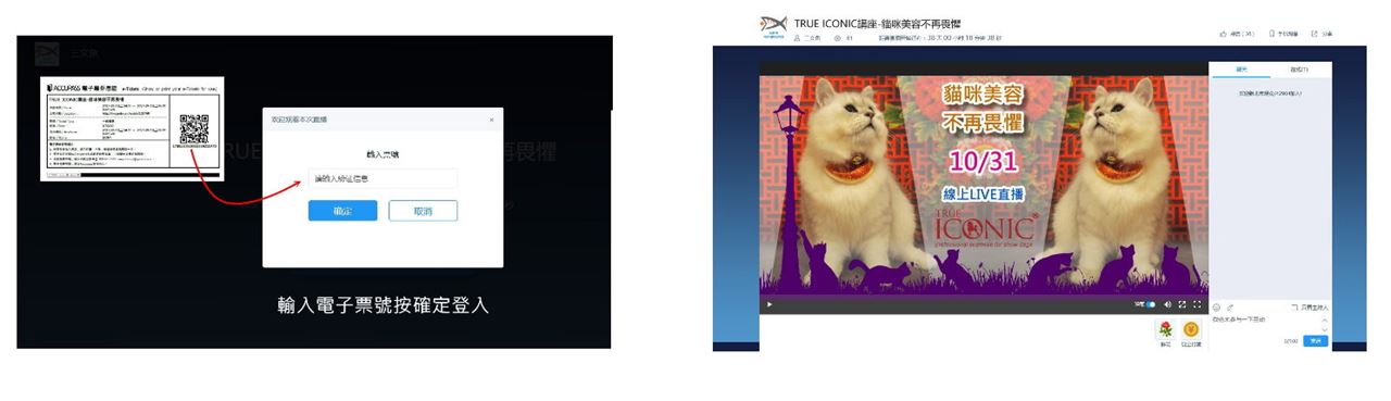 3.輸入電子票卷進入直播間 4.觀看直播並使用聊天室互動