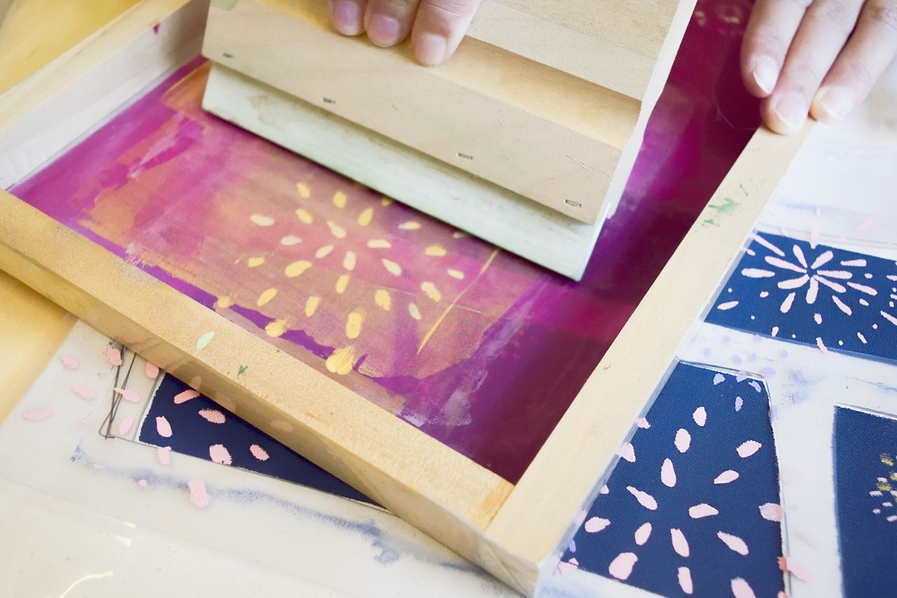課堂上會帶領學員用兩種方式創作,先用型染印出窗戶外的夜空,再以絹印層疊上煙火印花,並搭配遮罩技巧,即可完成乾淨又具有層次感的作品。花火的顏色也可依喜好自行混搭,並提供特殊的金屬色顏料,讓印花的祭典更加繽紛耀眼!
