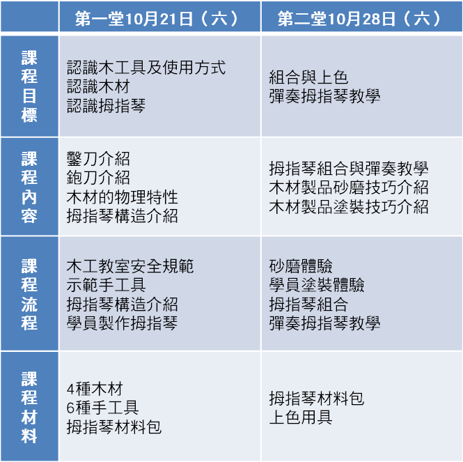 本課程透過兩個週六,共8個小時的時間,教你從無到有製作出屬於自己的拇指琴,並有簡單彈奏教學。學員將在課程中,認識木材特性、木工具及使用方式,學習砂磨、上油、組裝等技法。課程完成後,學員將帶會自己製作的拇指琴。適合成人、親子、祖孫一起來學!