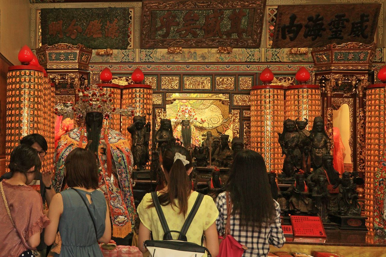 The Matchmaking God (also known as Yue Lao) holds a marriage appointment book and red threads. Everyone’s ideal partner is written on the marriage appointment book and is on the other end of an invisible red thread you wear on your wrist. Praying to Yue Lao is to ask Him to help summon the other end of the thread. It is said Yue Lao at Xia-Hai Temple is one of the most “responsive” Deities and has granted countless wishes. We will guide you the way we local people pray to Yue Lao. You report to Yue Lao your name, age (birth time), where you live, and the distinguishing features of the person you would like to meet. When you finish praying, don't forget to drink the blessed tea. That multiplies the bliss from Yue Lao