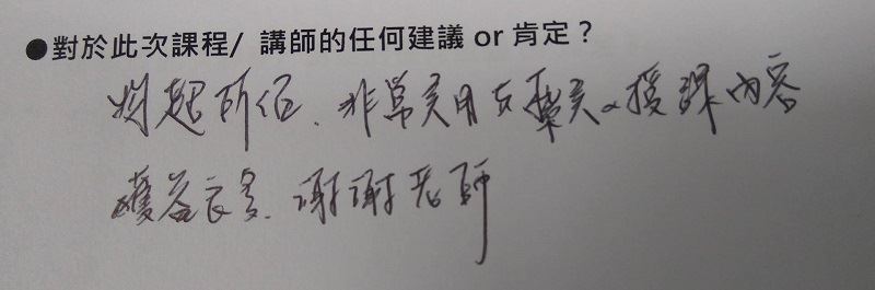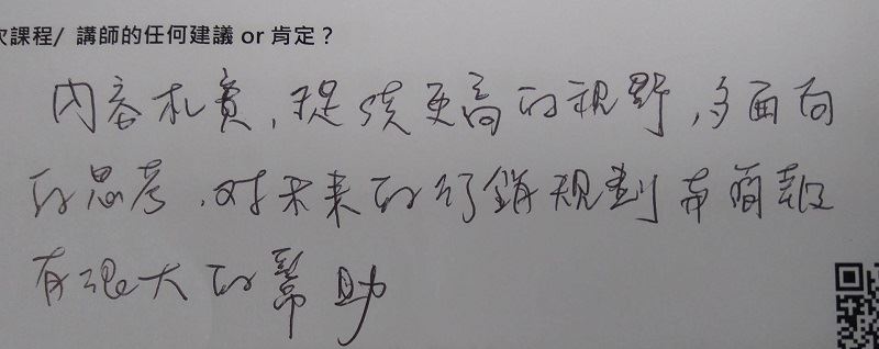 企業授課:阿里巴巴、理律律師事務所、聯合信用卡中心、樂天市集、合勤科技、KPMG、花旗銀行、三商美邦、開元食品、第一戴維斯、全興國際、正宏自動科技、松崗科技、新代科技股份有限公司、凱鈿行動科技、英威康科技、奧堤創意、台中品思(2014二月) 、遊石設計有限公司、安盛資訊、FAYA行銷、高德網路行銷、中小企業總會