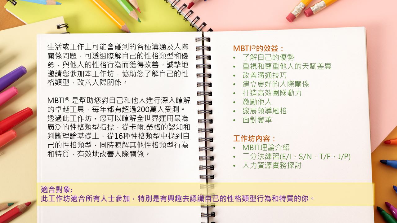 課程費用:NT$ 3,500(含個人課前正式 MBTI® 測評和專業報告及會後1 on 1解讀)