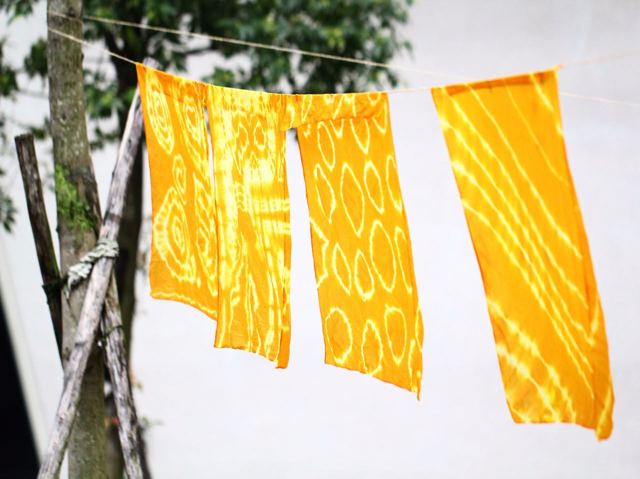 運用在地食材,不使用任何化學染劑,就能製作天然染巾,艷黃色澤方巾隨風搖曳