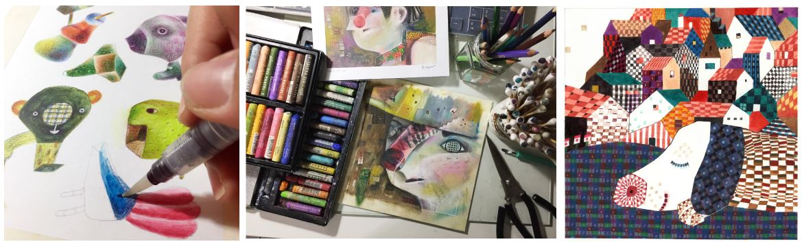 使用色鉛筆、水性蠟筆、粉蠟筆三種媒材上色,繪製風格作品。