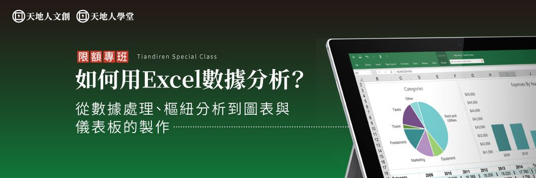 如何更輕鬆、更有效率的使用 Excel 這個工具?天地人文創旗下天地人學堂特地規劃出「如何用Excel數據分析?從數據處理、樞紐分析到圖表與儀表板的製作」課程,本課程將提供原始資料,讓學員透過實作:知道如何處理大量而紛雜的資料、並學會將資料轉為清晰圖表;且僅限24人小班制,讓學員都可以透過6小時高濃度課程,有效的運用 Excel 中的函數、樞紐分析、圖表等工具,學會更進階的Excel資料處理與分析能力,大幅提升工作效率與職場競爭力。