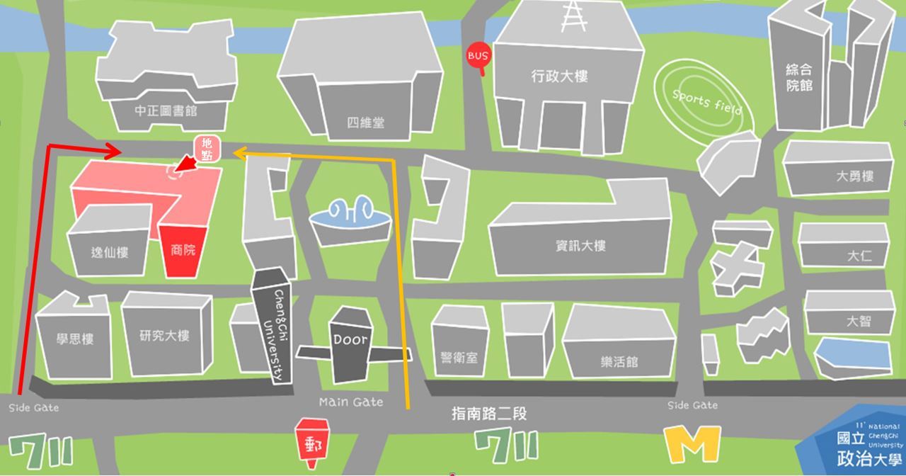 - 開車者(搭計程車者)請由學思樓旁的側門進入,即可抵達政治大學商學院。