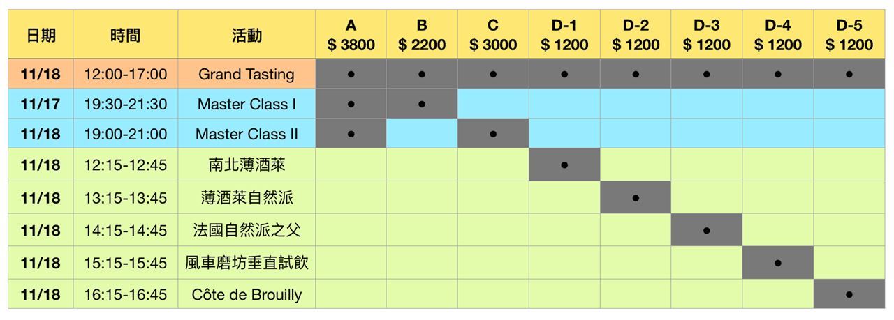 - D1:【Grand Tasting:美味・多樣・薄酒萊(11/18 12:00-17:00)】+【Atelier 1:南北薄酒萊(11/18 12:15-12:45)】