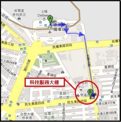 請搭乘捷運文湖線在「松山機場站」下車,沿著光復北路往南步行約10~15分鐘,即可抵達。請參考指引圖: