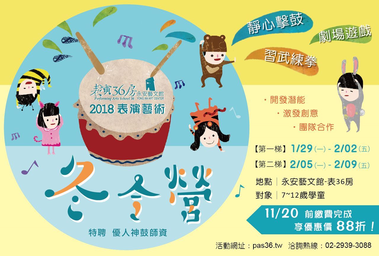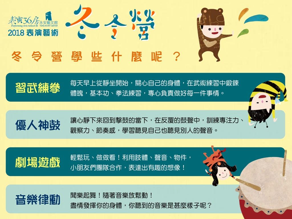 「2018表演藝術冬令營」結合靜心禪鼓、習武練拳、劇場遊戲等表演藝術課程,由優人神鼓師資群授課,開發肢體潛能與想像力,在歡笑間激發創意,在棒起棒落間培養專注力,在轉身起腳間加強肢體協調。讓孩子從表演藝術的學習中感受身體的節奏與律動的美好,培養欣賞藝術的生活美學觀。