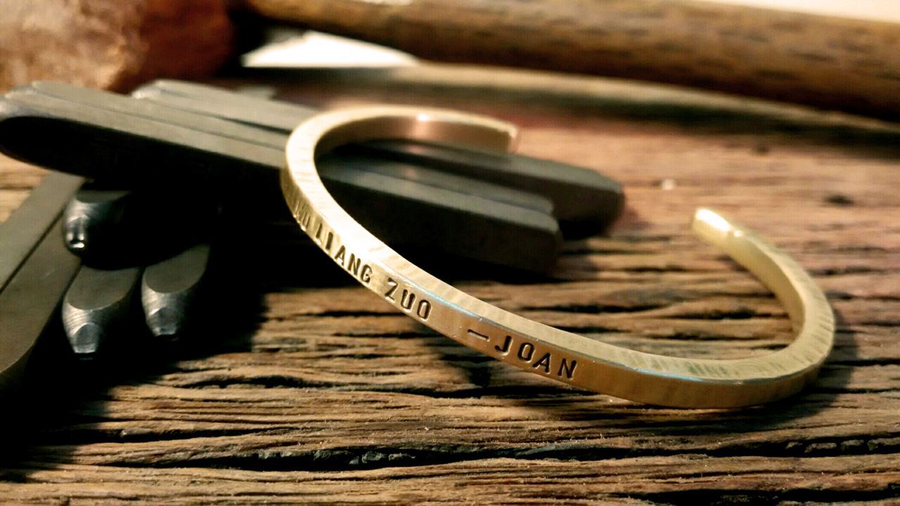 親手鍛敲黃銅手環一對,可打印英文字型,