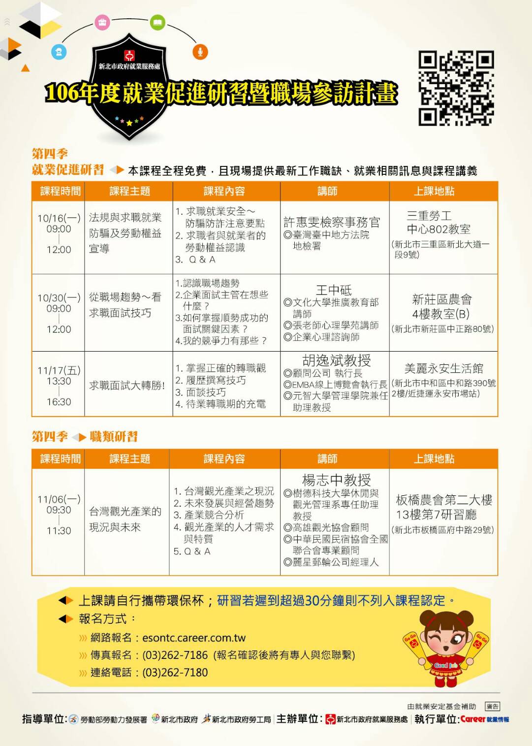 課程內容1.認是職場趨勢2.企業面試主管在想些什麼?3.如何掌握順勢成功的面是關鍵因素?4.我的競爭力有哪些?講師 :王中砥老師1.文化大學推廣教育部講師2.張老師心理學苑講師3.企業心理諮詢師系列活動
