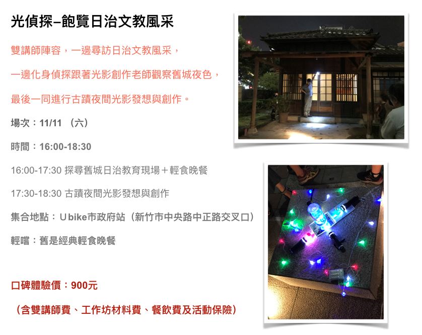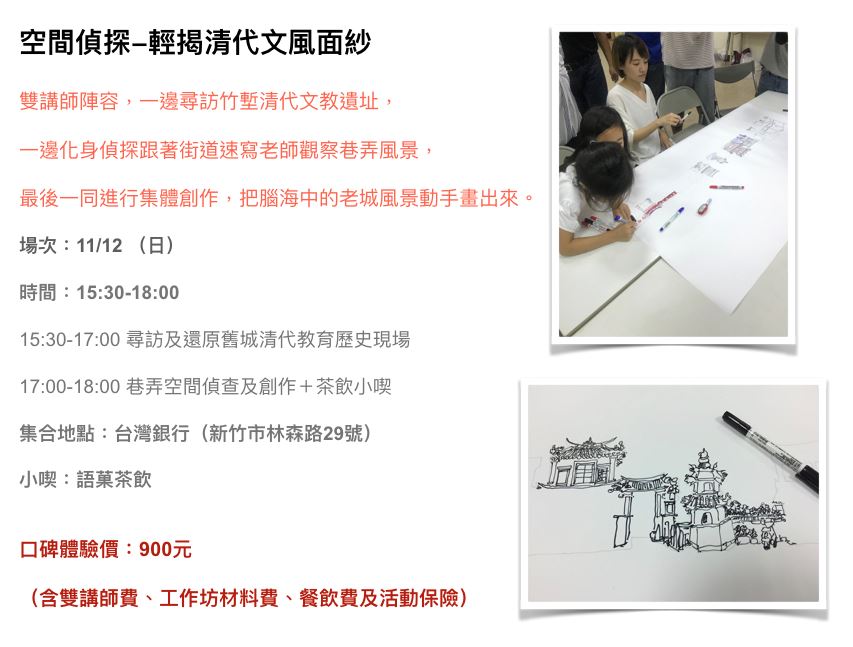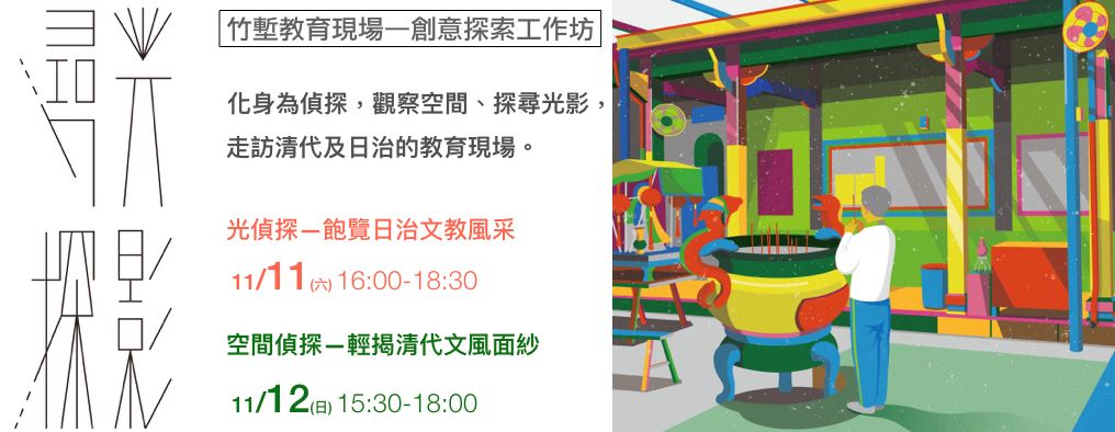 穿梭這座美麗城市的前世今生。化身為偵探,觀察空間,探尋光影,走訪清代及日治的教育現場。由導覽老師帶領一步步重拾記憶拼圖;而創意老師將引導以線條、光影為媒材,揮灑竹塹的美麗容顏。