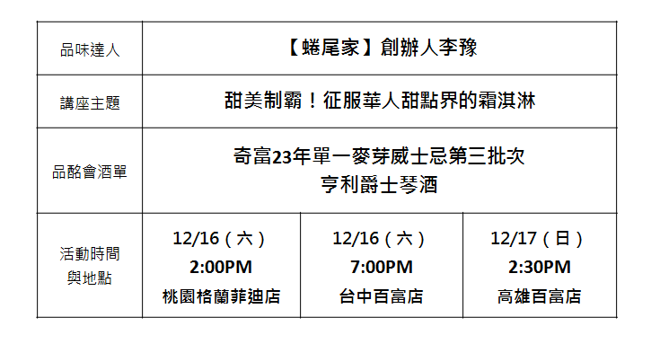 本次年終慶奇富講座,特別邀請【蜷尾家】創辦人李豫分享「甜美制霸!征服華人甜點界的霜淇淋」,現場更將特製酒窖限定液態氮冰淇淋,千萬別錯過!