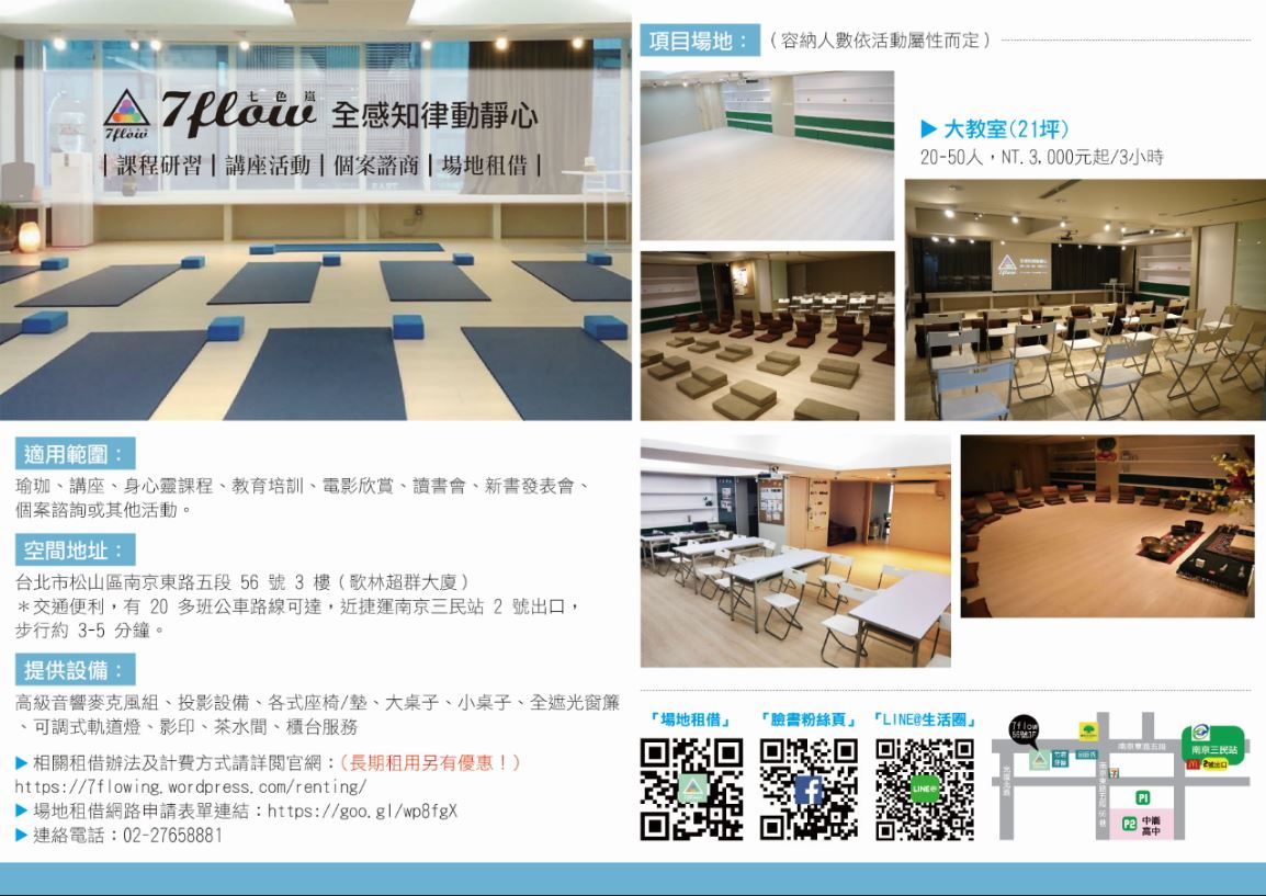 - 7flow空間方正寬敞好運用,加上優質木地版、可調式LED軌道燈與全遮光窗簾,設備齊全可多功能運用,適合不同課程活動需求,營造最佳空間氛圍。