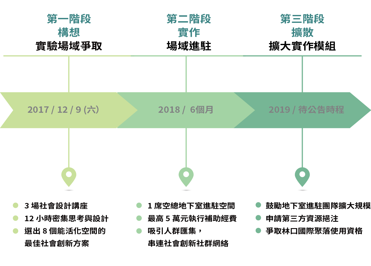 鼓勵具有社會創新想法的團隊在短時間內,透過密集思考與設計的過程,構思如何運用地下室空間做為未來實踐團隊理想的發展基地。