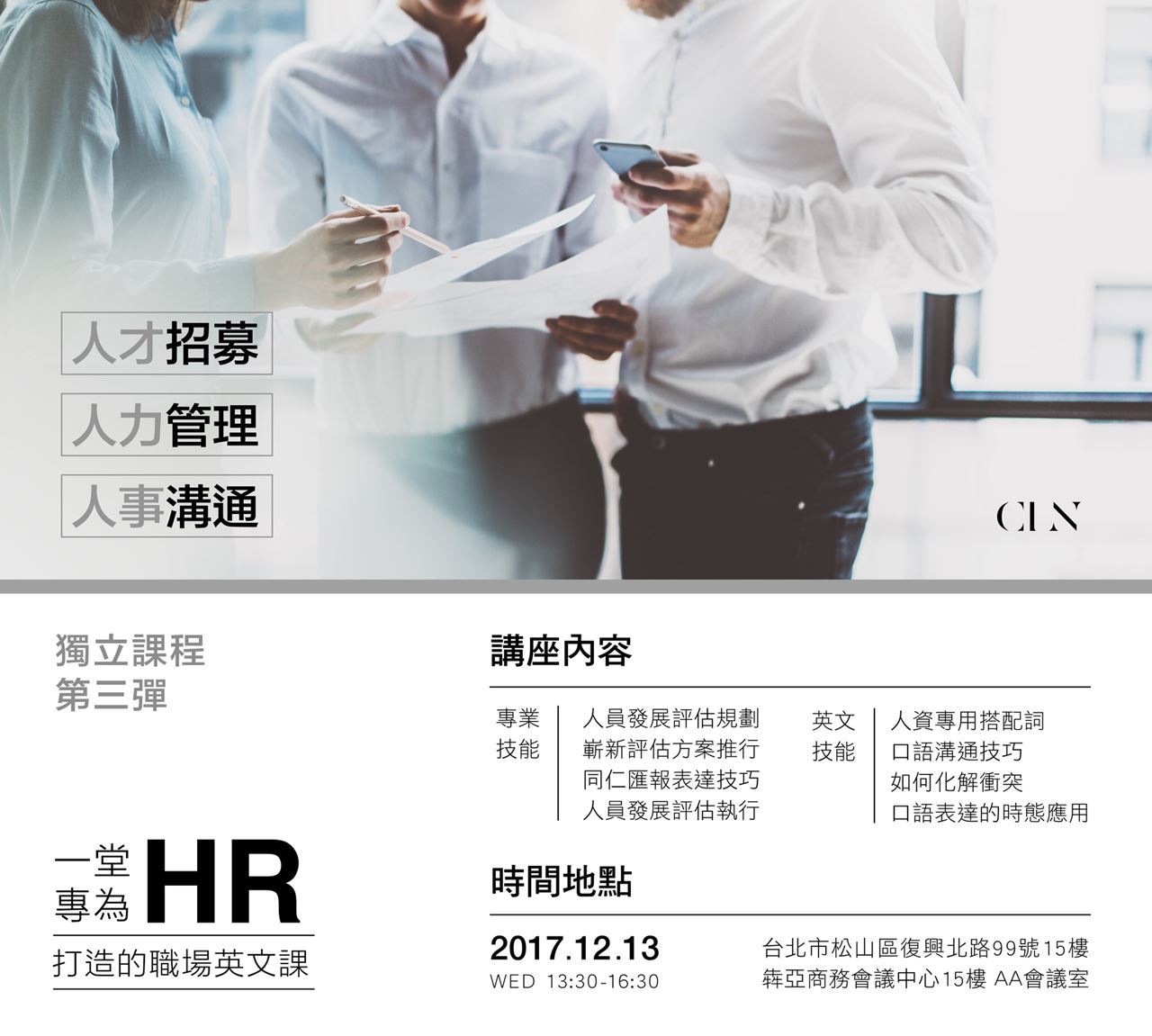 課堂中所授的專業技能將包含:人員發展的規劃執行、評估方案的推行、匯報的表達技巧,再加上人資搭配詞、口語溝通、衝突化解等英語技能,讓您職場專業力、英語能力兩者兼得。更多講座資訊與剪影,請參考此人資講座活動新聞稿。