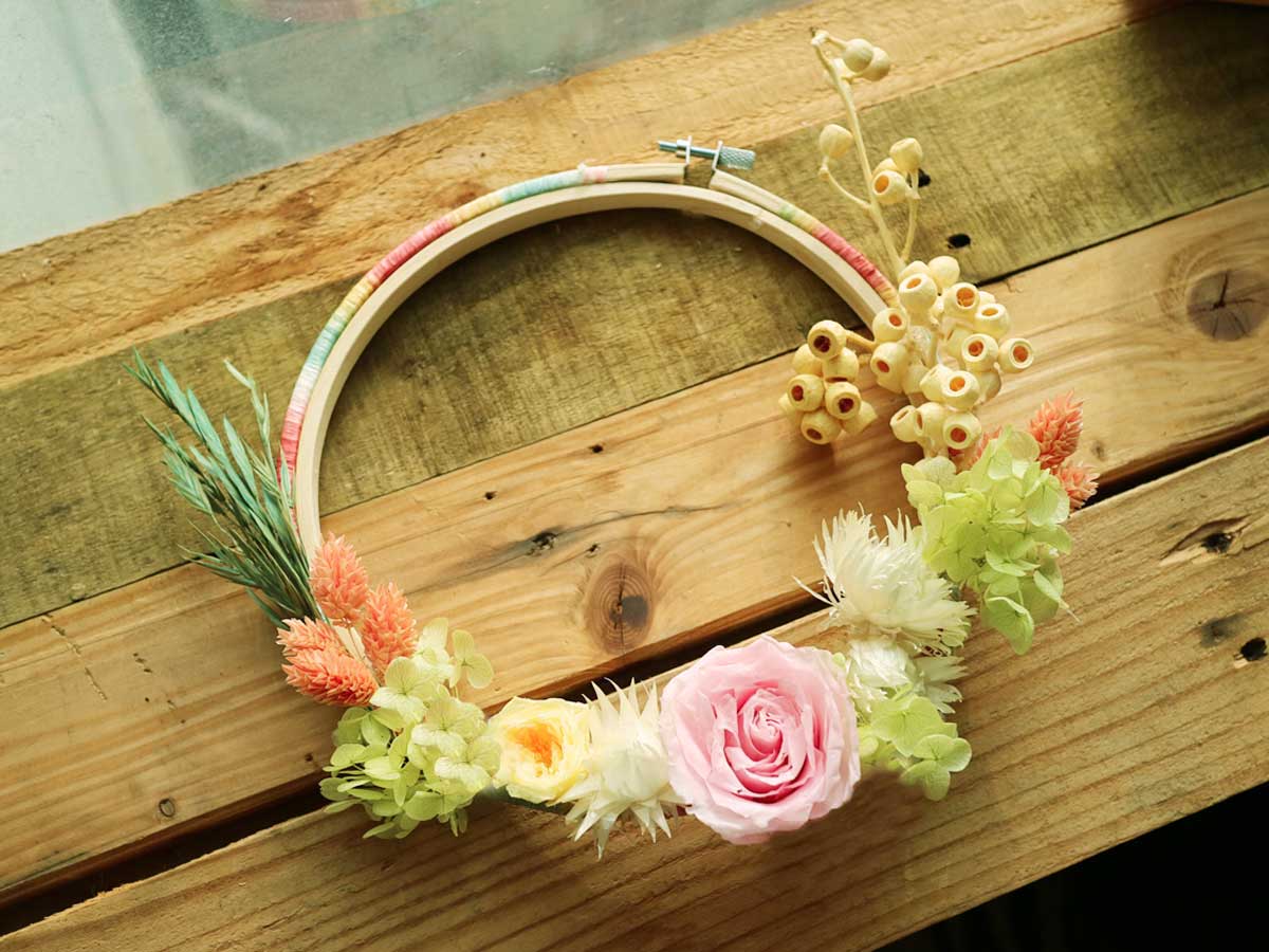 通過纏繞,捆綁,上鐵絲等技巧,完成一個花圈。課程中分享創作發想,色彩搭配,乾燥花的製作與保存等。