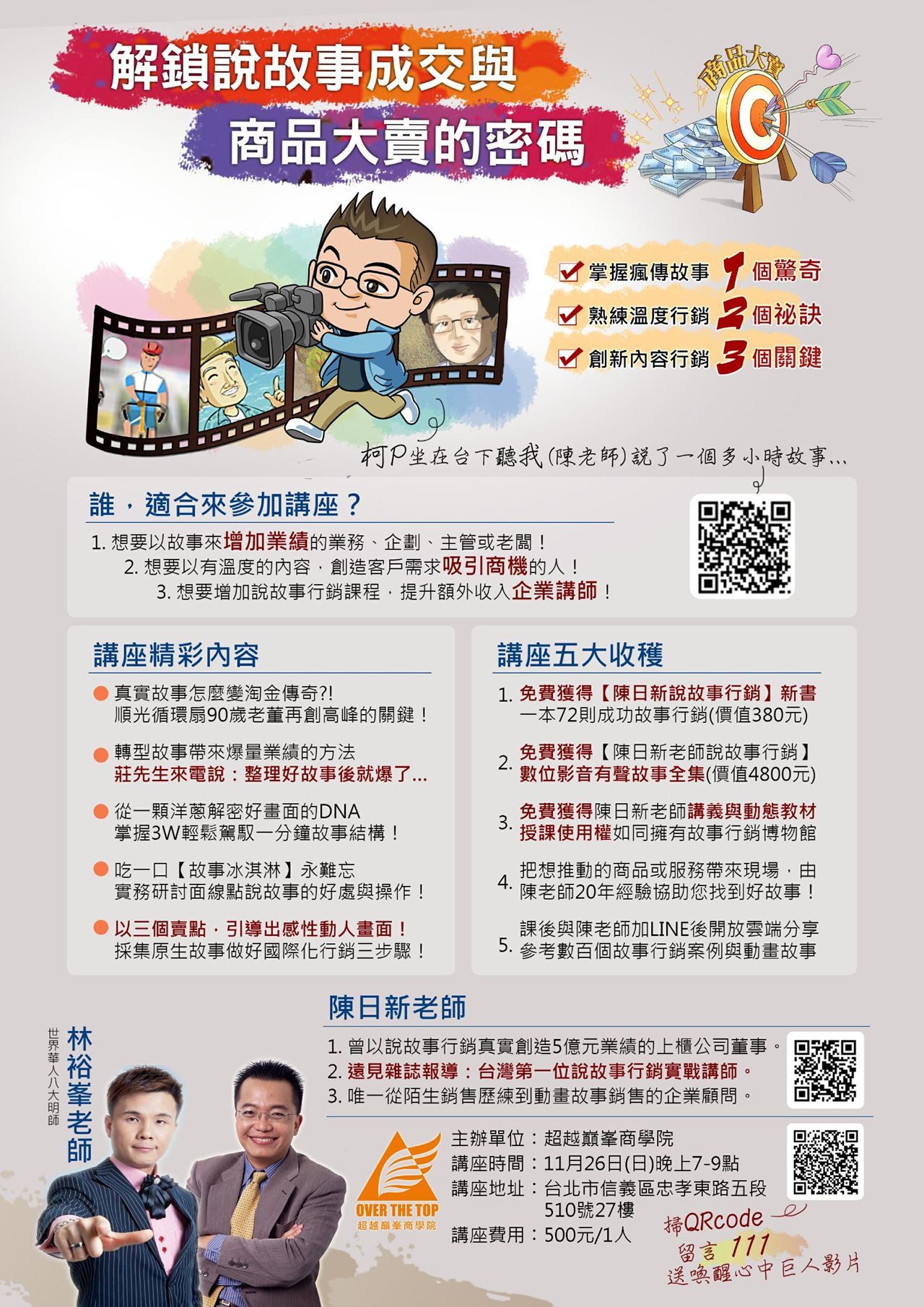 1.陳老師歷經十大重要商業歷練後,創辦了說故事行銷學院陌生推銷:他曾經銷售花旗銀行洋總裁成功,成為頂尖業務主管,並培育數十位月入超過六位數超級業務團隊!