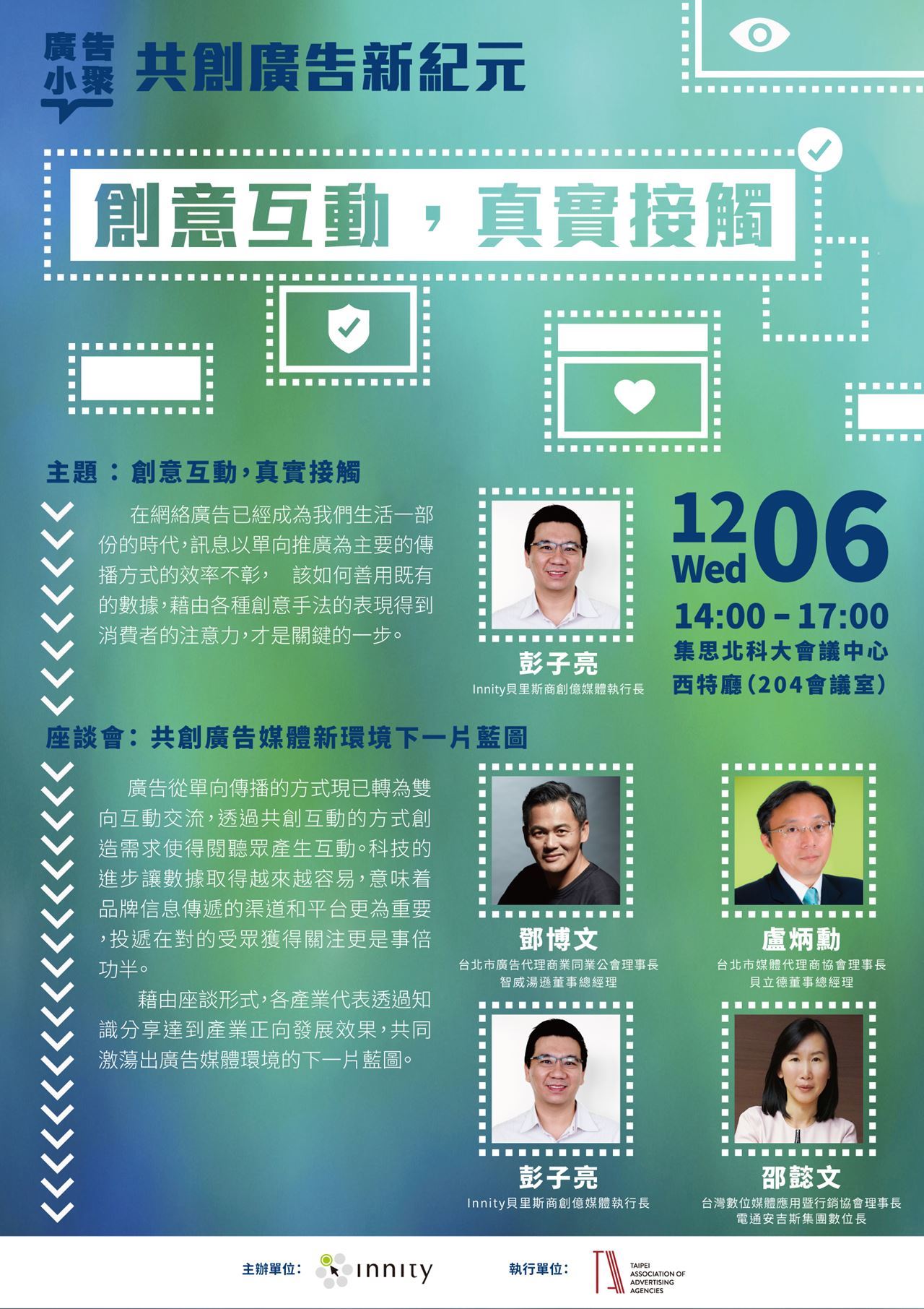 原訂於12月06日(三)下午2點,「廣告小聚-創意互動,真實接觸」因故取消,擇期再舉辦