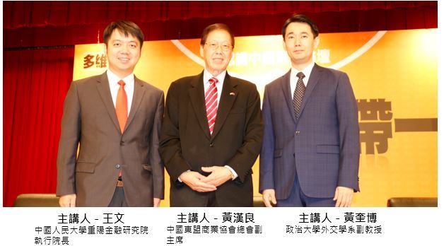邀請中國人民大學重陽金融研究院執行院長-王文、政治大學外交學系副教授擔任主講人-黃奎博、中國東盟商務協會總會副主席-黃漢良,