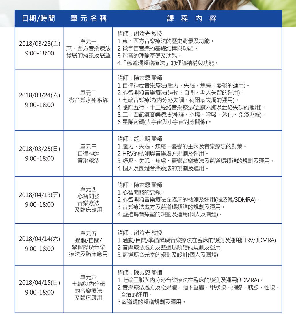 2.課程結合「藍道瑪智慧鍵盤」及「微宇宙音樂」兩大高科技專業音療系統,功能涵蓋精神、神經系統、免疫系統。