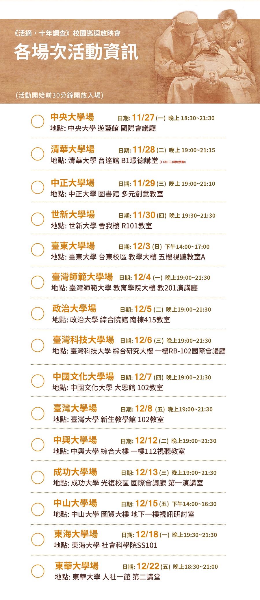 紀錄片《活摘·十年調查》歷年獲獎 :「 好萊塢國際獨立紀錄片 」 最佳外語片獎、最佳導演獎「美國 Mind Field 電影節」 最佳紀錄片 鑽石獎「Spotlight 國際電影節」 銀獎紀錄片簡介:《活摘 • 十年調查》以「 追查國際 」人權組織對中共活摘法輪功學員和良心犯器官的十年調查報告為藍本,其中95%的內容來自對中國大陸的活摘產業鏈的調查;被調查者包括與此有關的中國醫生、中共媒體的報導、中國醫院官網的報導,並收錄了對中共法院、政法委、「610」辦公室以及中國原國防部長和五名政治局常委的電話調查錄音,獲得了中共對法輪功學員進行系統性活摘器官的第一手證據。紀錄片通過大量證據表明,活摘法輪功學員器官是由前中共黨魁江澤民親自下令的國家性質的犯罪,由中共政法委分管、軍隊和司法系統執行運作。--上文部分摘錄自國際媒體 Epoch Times 中文報導紀錄片官網 : http://harvestedalive.com/?page_id=6全球放映:美國國會 放映 澳洲 墨爾本 放映 高雄 市議會 放映本次活動簡介: 台灣17所大專學校學生社團聯合舉辦紀錄片校園巡迴放映會,活動當天除了放映紀錄片「活摘·十年調查」之外,也特別邀請片中主角 追查國際主席 汪志遠醫師,透過從 美國紐約 連線至現場與觀眾作視訊互動,藉由紀錄片的觀賞可了解在中國大陸活摘人體器官的國際事件和深入認識中共的本質,進而呼籲「守護道德良知」的重要。活動粉專: https://www.facebook.com/truthinschool/
