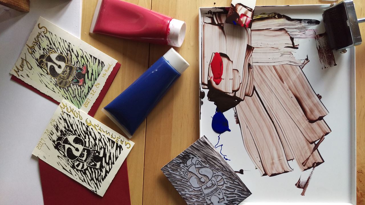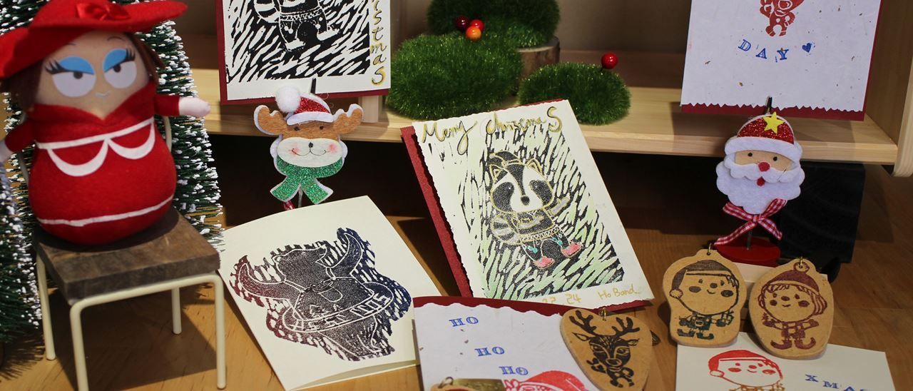 1. 學習刻板,製作出版畫,並透過轉印,製作出獨特的聖誕卡片