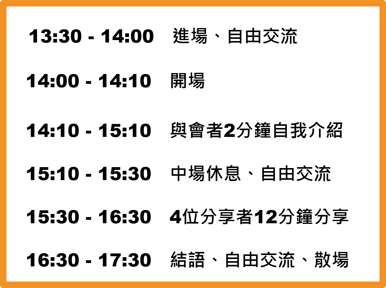 2.活動於 13:30 進場,14:00 開始,記得先吃過午餐,並帶上點心零食前來分享(份量、種類不拘)