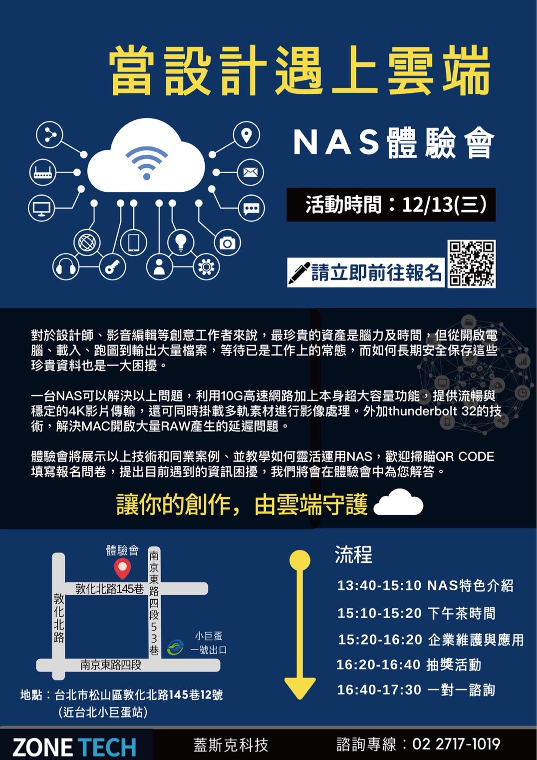 【產品介紹】【適合對象】*希望載圖、輸出檔案都不用再長時間等待的設計業者*希望可以找到大容量儲存4K影片的剪輯師*希望了解更多有關NAS雲端設備的工作者【活動嘉賓】現場備有精美下午茶點,還會有抽獎活動!💰NAS 1,000折扣優惠卷 3名💰NAS 5,000折扣優惠卷 1名主辦單位:蓋斯克科技協辦單位:QNAP 威聯通科技股份有限公司