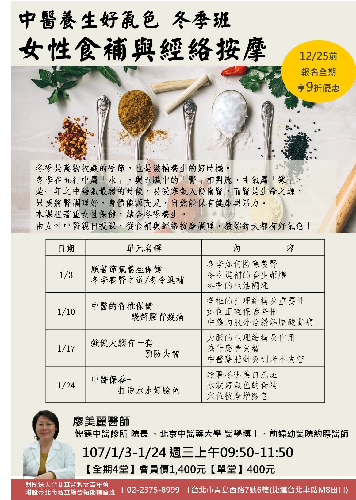 線上報名 :http://www.ywca-taipei.org.tw/edu/lift165.htm台北基督教女青年會台北市中正區青島西路7號(捷運台北車站M8出口)報名專線:02-2375-8999