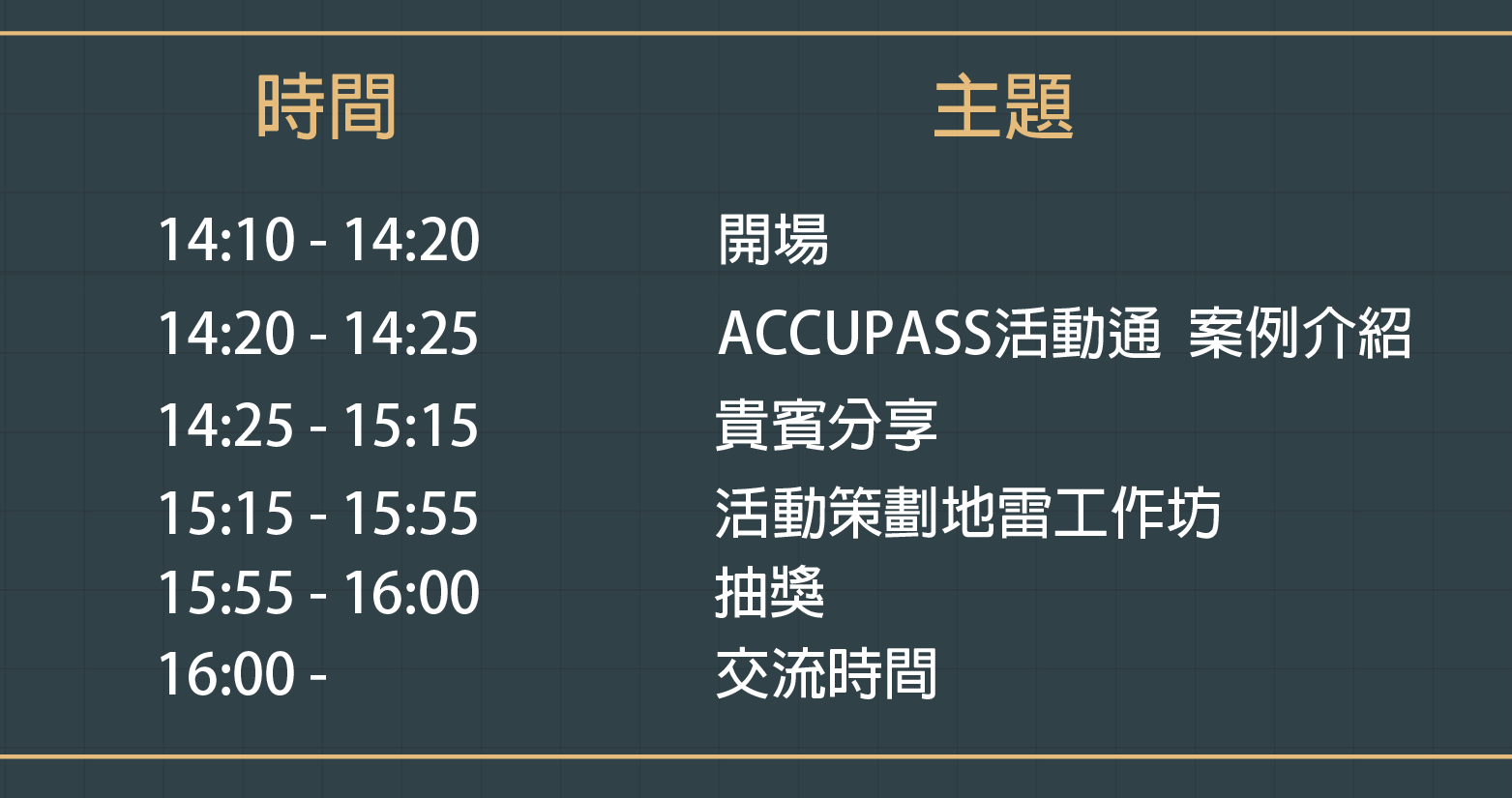 | 於Accupass揭密十大活動地雷時段,手中小卡所寫項目若符合台上十大地雷內容,請將該項目於小卡上做記號,連成一線即可獲得精美小禮並受邀上台與大家分享過往活動經驗(舉辦活動時遇到的狀況,如何因應與解決方法)。