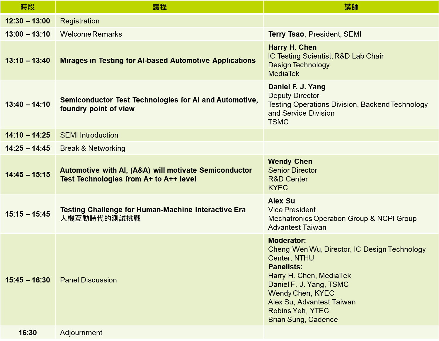 在人工智慧、物聯網、5G、雲端運算、車用電子等新興應用逐漸從發想演變為實際商品應用,以及系統級、晶圓級封裝等先進封裝技術持續進展的雙重趨勢推動下,創新與高階IC 測試需求也因應而生,也為測試領域創造新的市場機會與挑戰;研究單位預測到2025 年AI 的產值可望達到386 億美元,而車用電子的產值則會達到584 億美元,受到這兩股強大驅動力的帶動,市場持續看好AI應用與車用電子成為半導體大宗應用的領域。SEMI 希望藉由本研討會作為產業交流平台,邀請 MediaTek、TSMC、KYEC 及 Advantest Tawian 等產業界重量級講師,以「AI IC and Automotive IC Test Technology Forum 人工智慧晶片及車用晶片測試技術論壇」為主題,探討下個世代半導體測試產業的機會與挑戰。