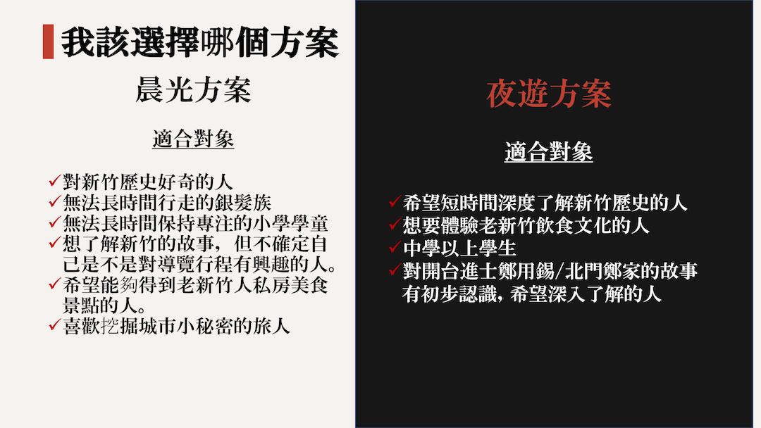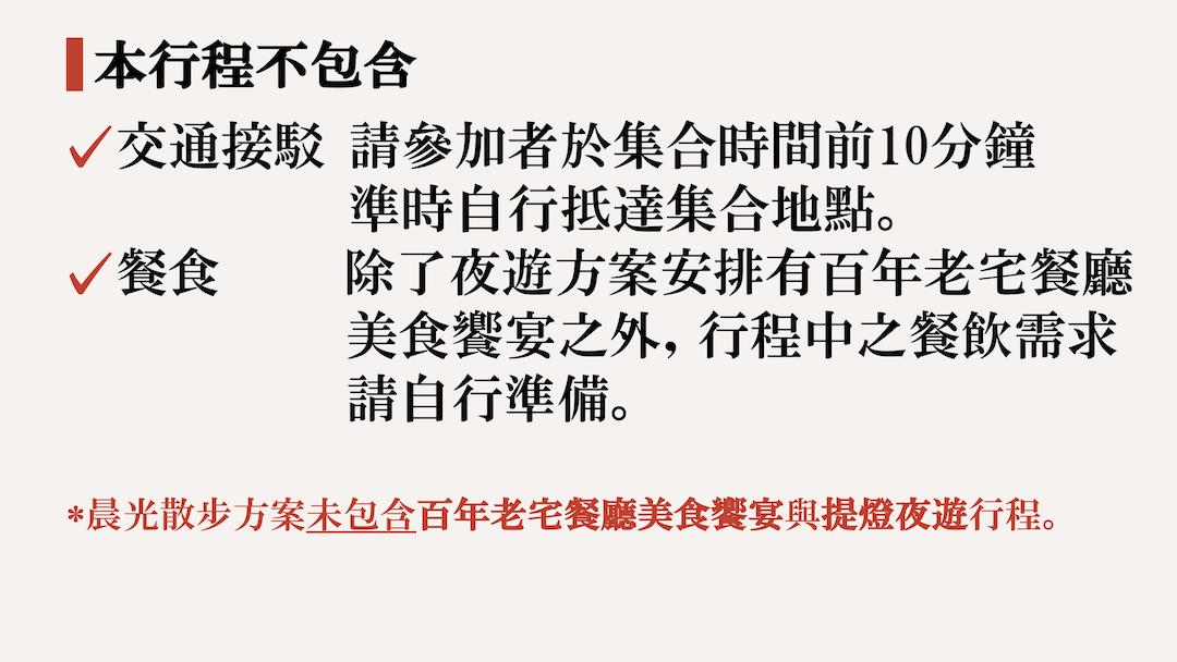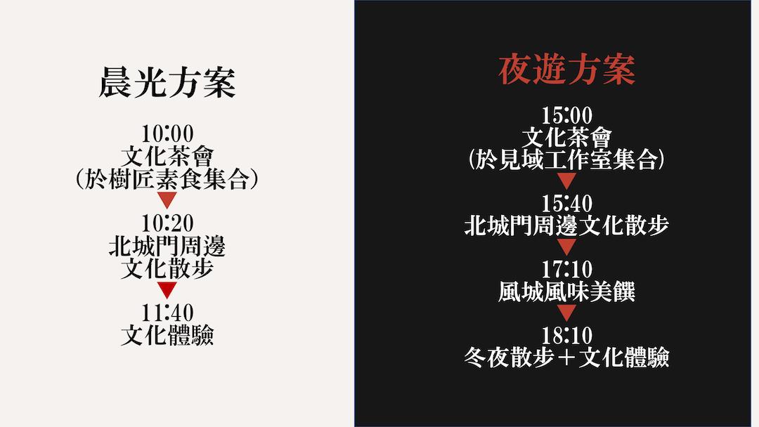 晨光散步方案集合地點於樹匠蔬食(新竹市北區中央路43號),夜遊散步方案集合地點於見域工作室(新竹市北區北門街74號)