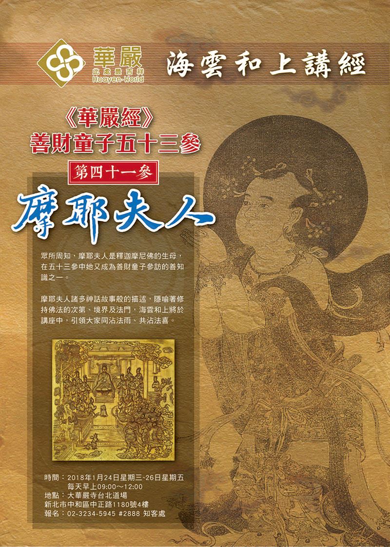 大華嚴寺導師 海雲和上曾於1997年至2015年間陸續講演《善財童子五十三參》第一參至第四十參,如今將於2018年1月24日至26日(每晚09:00~12:00),於大華嚴寺台北道場開講《善財童子五十三參》之「第四十一參」:摩耶夫人。