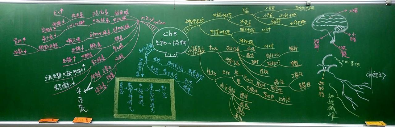 下圖是明騰老師在國中生物課教學過程所繪製的心智圖,以及學生們上課時學習而繪製的心智圖:
